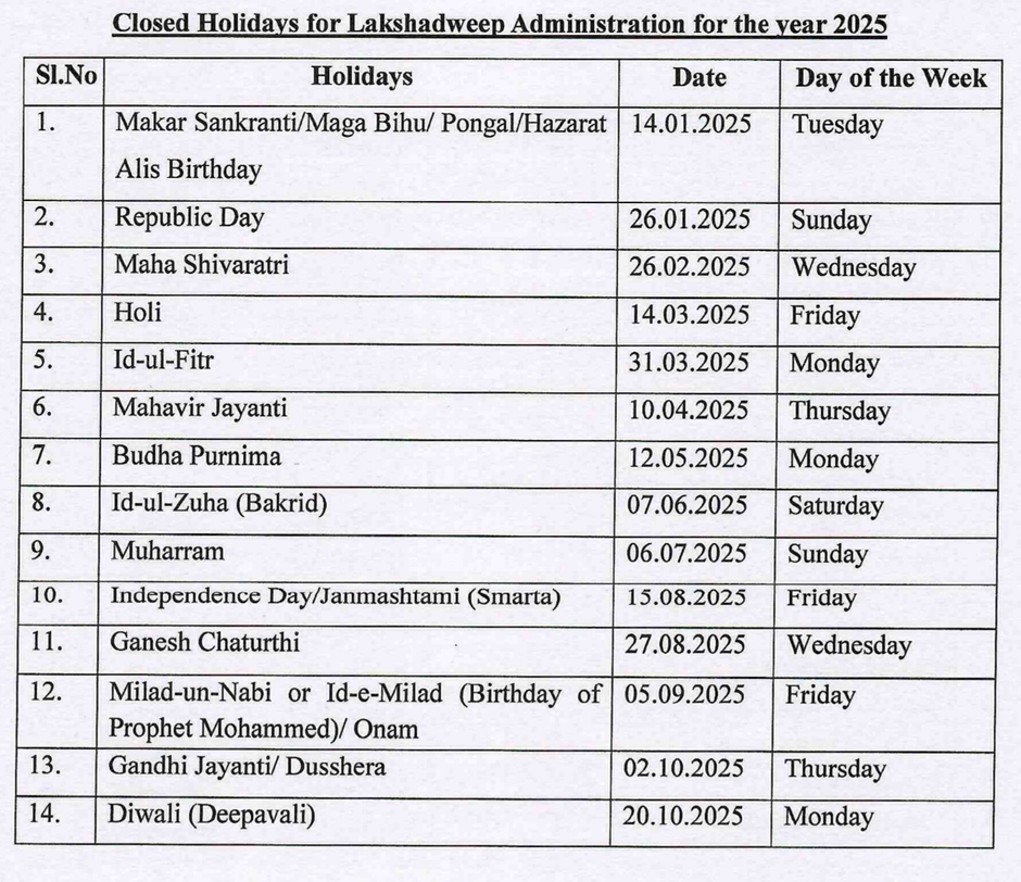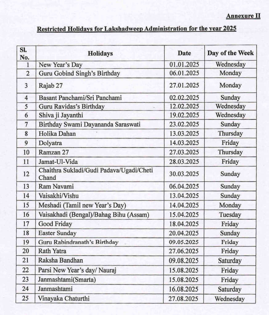 The Hon’ble Administrator of the Union Territory of Lakshadweep on October 17th 2024 declared the holiday schedule for 2025, specifying which days will be observed as closed and restricted holidays across all government offices.